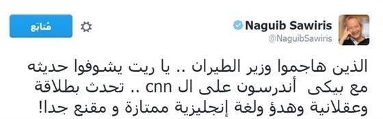وقال «ساويرس»، عبر حسابه الشخصى بموقع التواصل الاجتماعى «تويتر»، اليوم الأحد: «الذين هاجموا وزير الطيران.. يا ريت يشوفوا حديثه مع بيكى أندرسون على الـ cnn.. تحدث بطلاقة وعقلانية وهدوء ولغة إنجليزية ممتازة ومقنع جدا!».